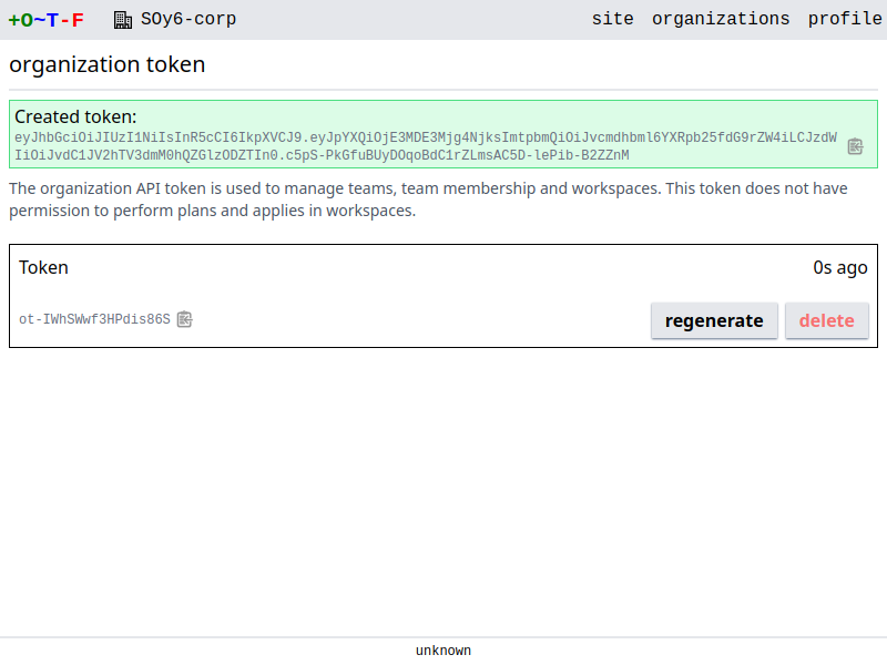 Click the clipboard icon to copy the token to your system clipboard. You can then use the token to authenticate via the API or the otf CLI.